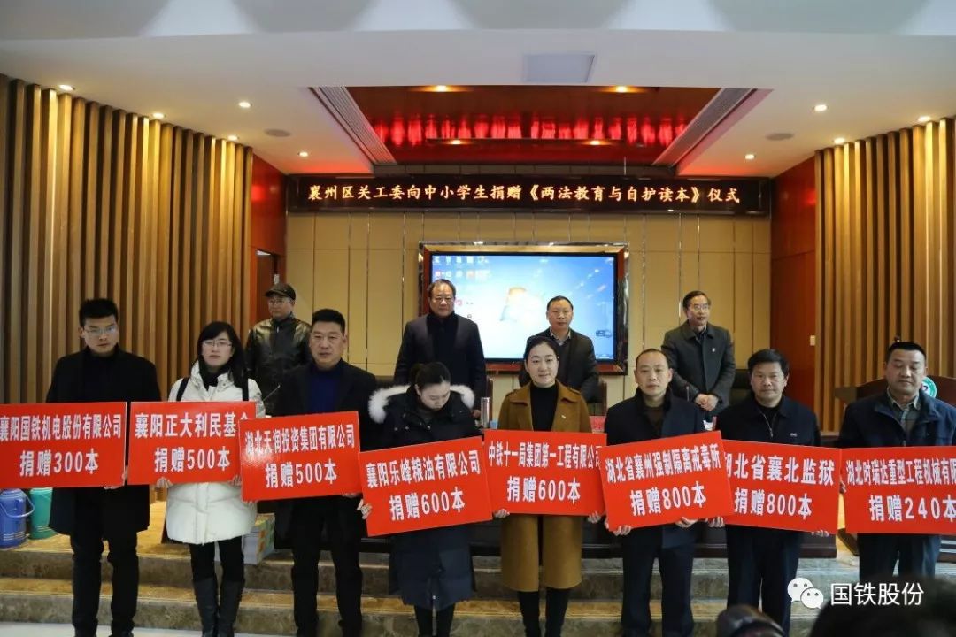 12月19日,襄州區關工委向中小學生捐贈《兩法教育與自護讀本》儀式在張灣中心學校舉行。在區關工委的倡議下,襄陽國鐵積極響應,向中小學生捐贈圖書300本。